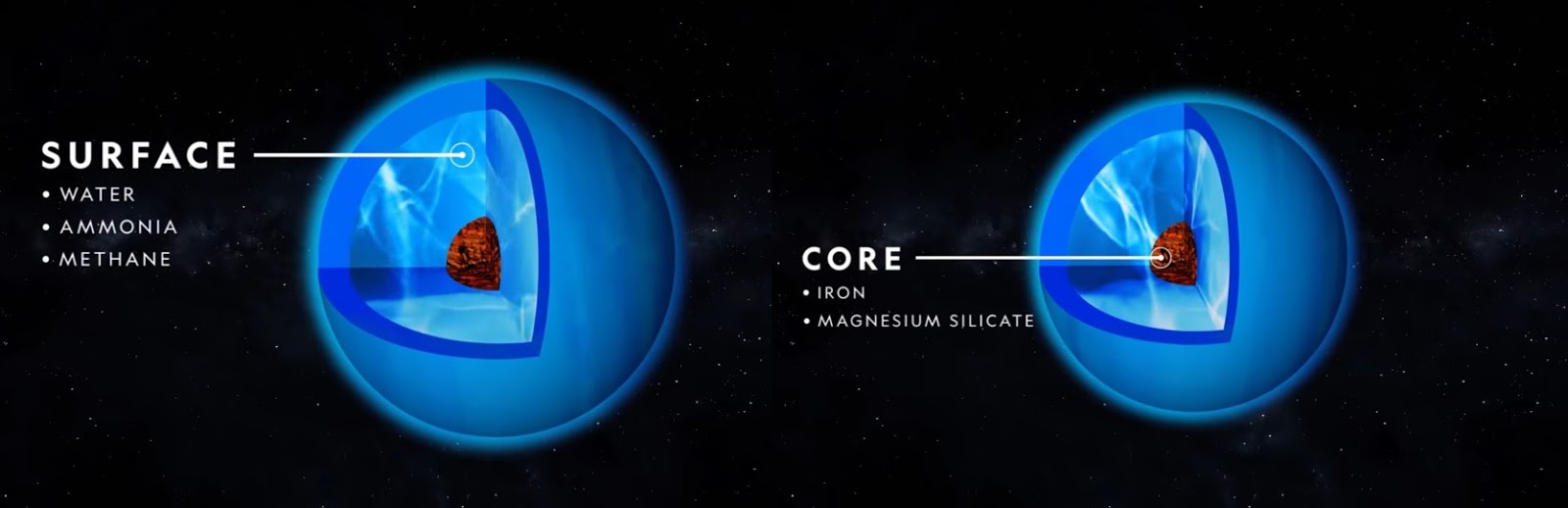 Uranus is about 4 Earth’s wider and it has a core which alone is the size of Earth, the core is made of Iron and Magnesium silicate and the remainder, approximately 80% of Uranus is a worldwide oceans of ices made of water, ammonia and methane which is the chemical behind planet’s blue color, this icy composition prevents Uranus from generating much internal heat and as a result the weather on Uranus is colder compared to the other gas giants. Uranus is more than 1.7 billion miles or about 3 billion kilometers from the Sun and because it is so far away it takes Uranus almost 84 Earth years to orbit around the Sun and that means each season on Uranus lasts for 21 Earth years, in addition Uranus is tilted much more than the Earth is.