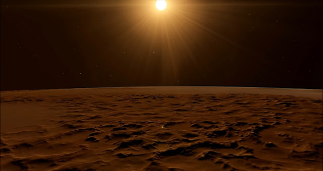 Let’s say we are somehow protected from all possible dangers on the planet, so as we move around the planet we likely would notice many mountains, volcanos and other interesting but predictable geological features. Now, we do not know how the ground of the planet would feel like, it could be icy or it could be rocky but it is more likely that it is more icy considering the lower temperatures on the planet, so because of that the ground would likely appear to be a bit shiny.